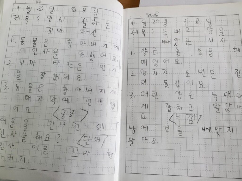 한글 교육을 위해서 가장 우선해야 할 활동은 독서이다. 독서 습관 형성을 위해 학교 도서관에서 대출증이 발급된 날부터 매일 대출하기를 약속했다. 우리반은 매일 아침 등교하자마자 어제 대출받은 책을 반납하고 새로운 책을 대출해서 읽는다. 도서 대출을 시작하고 쓰기 노트를 시작했기에 아침 활동도 변경했다. 한글 낱말 발표에서 수준을 한단계 높여 친구에게 돌아가며 그림책을 읽어주기로 했다. 지난 금요일에 처음 시작했는데, 처음이라 긴장되었을 텐데 첫 아이부터 아주 적당한 책을 잘 골라서 읽어주었다. 상황별 사용되는 낱말의 쓰임과 책 속에 나오는 의태어도 그림을 보며 더 잘 이해했다. 첫 아이의 그림책 읽어주기가 끝나자 다음에 어떤 책을 읽어주면 좋을지 고민하며 이런저런 질문을 하는 아이들의 모습이 참 사랑스러웠다.